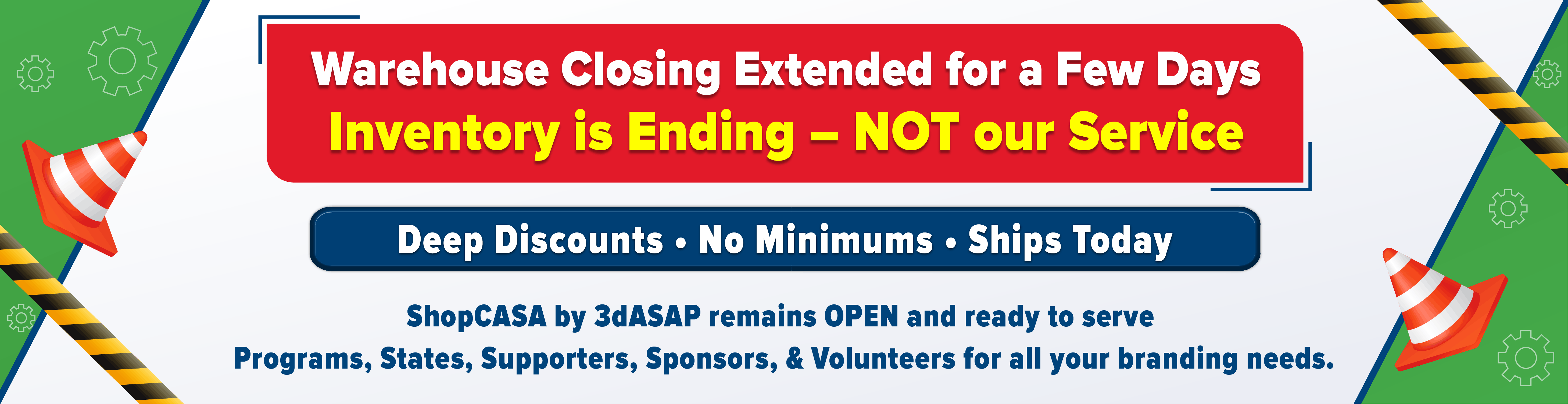 Warehouse Closing Extended. Shop remaining inventory with Deep Discounts, No Minimums and Ships in 24 Hours. | Inventory is Ending – ShopCASA is Here to Stay for all you print & promotional needs.